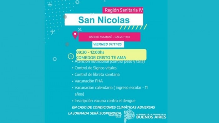 Durante la jornada realizaran atención nutricional (control peso y talla), control de signos vitales, de libreta sanitaria, vacunación contra la Fiebre Hemorrágica Argentina, vacunación de calendario (ingreso escolar - 11 años) e inscripción para la vacuna contra el dengue.
