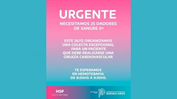 El Hospital San Felipe lanzó una convocatoria urgente para reunir 25 donantes de sangre grupo O positivo, en el marco de una colecta excepcional destinada a un paciente que debe someterse a una cirugía cardiovascular.