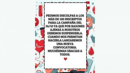 La campaña de donación de sangre que iba a realizarse el próximo 26 de octubre en la UTN San Nicolás, quedó suspendida.
