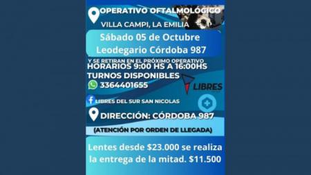 Libres del Sur organiza nuevamente el servicio de venta de anteojos a precios accesibles y la entrega de los tramitados en el operativo anterior. Se realizará el sábado 5 de octubre de 9:00 a 16:00 en Leodegario Cordova 987.