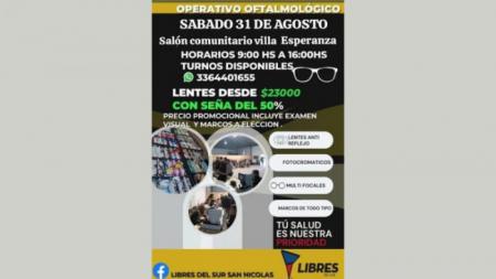 Libres del Sur organiza nuevamente el servicio de venta de anteojos a precios accesibles y la entrega de los tramitados en el operativo anterior. Se realizará el sábado 31 de agosto en el salón comunitario Villa Esperanza.