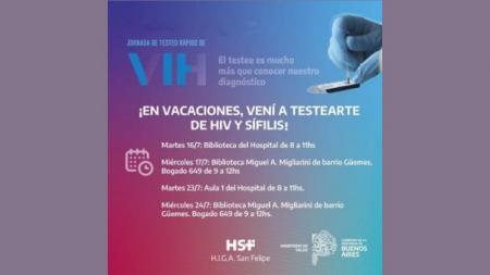Durante las vacaciones de invierno, el Hospital provincial San Felipe estará llevando a cabo jornadas de testeos rápidos de VIH y sífilis.