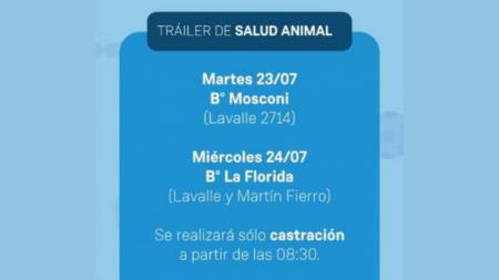 El martes 23 de julio, el tráiler de castración y vacunación de la Municipalidad se encontrará brindando el servicio en calle Lavalle 2714, barrio Mosconi, y el miércoles 24 de julio, en Lavalle y Martín Fierro, barrio La Florida.