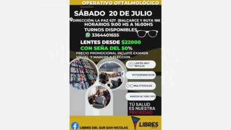 Libres del Sur organiza nuevamente el servicio de venta de anteojos a precios accesibles y la entrega de los tramitados en el operativo anterior. Se realizará el sábado 20 de julio de 9:00 a 16:00 en La Paz 627.