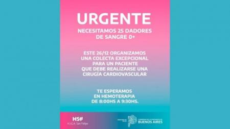 El Hospital San Felipe lanzó una convocatoria urgente para reunir 25 donantes de sangre grupo O positivo, en el marco de una colecta excepcional destinada a un paciente que debe someterse a una cirugía cardiovascular.