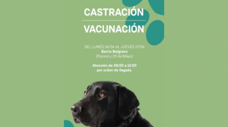 Desde el lunes 10 al viernes 14 de abril, el servicio de castración y vacunación antirrábica de la Municipalidad atenderá en barrio 9 de Julio, en Jujuy y Del Pozo. La atención será de 8.00 a 12.00 hs., por orden de llegada.