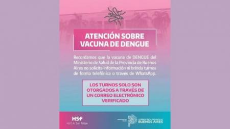 El Hospital San Felipe informa que la vacuna de Dengue del Ministerio de Salud de la Provincia de Buenos Aires no solicita información ni brinda turnos de forma telefónica o a través de WhatsApp.