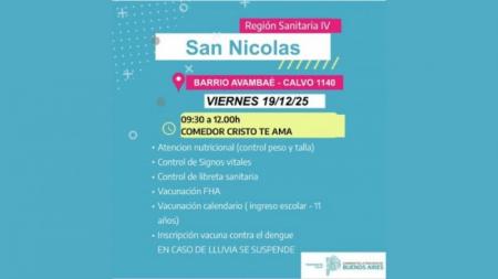 La Región Sanitaria IV llevará a cabo el viernes 19 de diciembre una jornada de atención y control de salud en barrio Avambaé. Se desarrollará de 9:30 a 12:00 horas en el Comedor Cristo Te Ama, ubicado en Calvo 1140.
