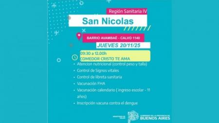 La Región Sanitaria IV llevará a cabo este jueves 20 de noviembre una jornada de atención y control de salud en barrio Avambaé. Se desarrollará de 9:30 a 12:00 horas en el Comedor Cristo Te Ama, ubicado en Calvo 1140.
