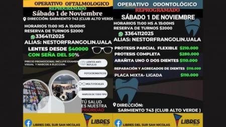 Libres del Sur reprogramó el servicio de venta de anteojos a precios accesibles y el operativo odontológico. Se realizarán juntos el próximo sábado 1 de noviembre.