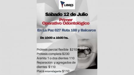 El próximo sábado 12 de julio, Libres del Sur realizará el primer operativo odontológico en La Paz 627, Ruta 188 y Balcarce. El horario será de 10:00 a 16:00 hs.