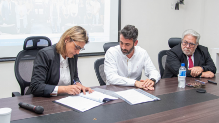 Cecilia Comerio firmó un convenio con el vicerrector de la Universidad Tecnológica Nacional (UTN), Haroldo Avetta, para que estudiantes de la institución académica puedan realizar sus pasantías en el puerto local.