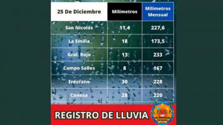 Avisos Meteorológicos San Nicolás informa que el agua caída durante la madruga del lunes 25 en San Nicolás fue de 11,4. Durante el mes de diciembre el registro de lluvia para nuestra ciudad es de 227,6.