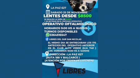 Libres del Sur organiza nuevamente el servicio de venta de anteojos a precios accesibles y la entrega de los tramitados en el operativo anterior. Se realizará el día sábado 25 de noviembre de 9:00 a 16:00 hs en La Paz 627.