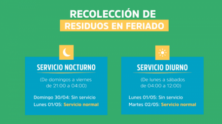 Debido al feriado del lunes 1 de mayo (Día del Trabajador) habrá cambios en la frecuencia de la recolección de residuos sólidos urbanos. Se pide a los vecinos que, atendiendo los días y horarios del servicio, cuiden de la limpieza