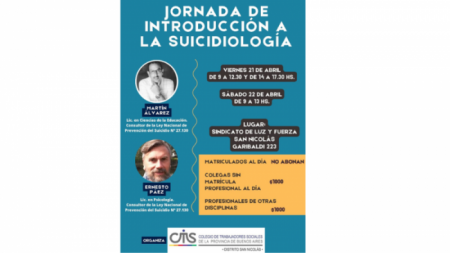 Los días viernes 21 y sábado 22 de abril en la sede del Sindicato de Luz y Fuerza, ubicado en Garibaldi 223, se desarrollarán las Jornadas de "Introducción a la Suicidiología".