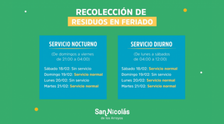 Debido al feriado por Carnaval los días lunes 20 y martes 21 de febrero, habrá cambios en el servicio de recolección de residuos que realiza la empresa ENTRE.