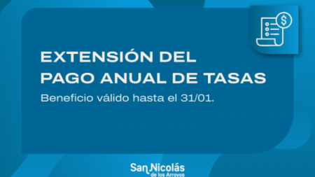 La Municipalidad de San Nicolás informa que, hasta el 31 de enero, los contribuyentes podrán realizar el pago anual de Tasas Municipales con un descuento del 6% tanto para la de Desarrollo Urbano como para la de Aguas San Nicolás.