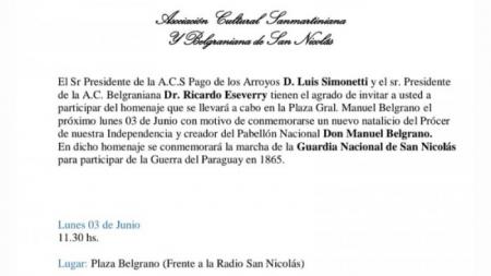 El próximo lunes 3 de junio a las 11:30, se llevará a cabo un homenaje en la plaza Gral. Manuel Belgrano para recordar un nuevo natalicio del prócer y creador del Pabellón Nacional, Don Manuel Belgrano.