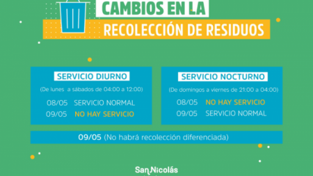 La Municipalidad de San Nicolás informa que, debido al paro general del jueves 9 de mayo, se aplicarán cambios en la recolección de residuos sólidos urbanos.