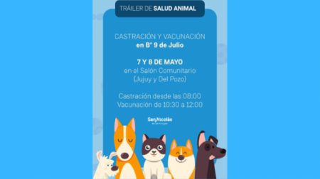 La Municipalidad de San Nicolás llevará a cabo el servicio de castración y vacunación los días martes 7 y miércoles 8, en el salón comunitario de barrio 9 de Julio, que se encuentra en Jujuy y Del Pozo.