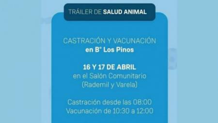 Este martes 16 y miércoles 17, el tráiler de Salud Animal brindará el servicio de castración y vacunación antirrábica en barrio Los Pinos. Las castraciones se realizarán desde las 8:00 y las vacunaciones de 10.30 a 12:00.
