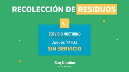 La Municipalidad de San Nicolás informa que hoy no habrá recolección de residuos nocturna. Se solicita a los vecinos no sacar las bolsas y aguardar a que el servicio se restablezca en el día de mañana.