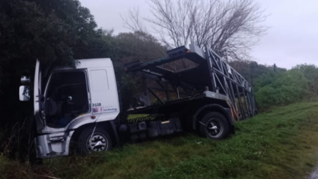 El conductor de un camión marca Ford perdió el control del vehículo y despistó, volcando sobre la banquina de la autopista.