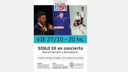 El Colegio de Escribanos de San Nicolás presenta "Siglo XX en concierto", Daniel Vercelli y Romiphonic. Este acto cultural se realizará el viernes 27/10 a las 20 hs a beneficio del Hogar San Hipólito en la Delegación San Nicolás.