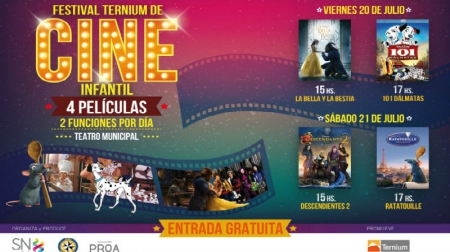 Este viernes 20 y sábado 21 de julio, se proyectarán 4 títulos de películas cedidas por Disney: La bella y la Bestia, 101 Dálmatas, Descendientes 2 y Ratatouille. Habrá funciones a las 15 y a las 17 hs en el Teatro Municipal.