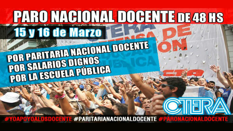 La Confederación Nacional de Trabajadores de la Educación (Ctera) convocó a un paro de 48 horas para el miércoles 15 y el jueves 16, y a una nueva medida el martes 21 y el miércoles 22 en todo el país, para participar de una marcha federal educativa, como consecuencia de la falta de acuerdo que hubo en las paritarias que mantuvieron los gremios docentes y los gobiernos de la Ciudad y de la provincia de Buenos Aires.