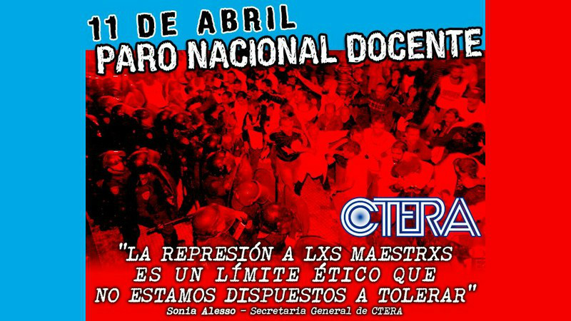 aro general contra la represión. No se toca a un maestro." La titular de Ctera, Sonia Alesso, anunció un huelga general docente de 24 horas para mañana tras el operativo de la Policía de la Ciudad que desalojo con palos y gas pimienta a los maestros que intentaban instalar la "escuela itinerante", que será instalada esta tarde a las 17 frente al Congreso con el acompañamiento de un abrazo simbólico. La titular de la Ctera volvió a exigir la convocatoria a la paritaria nacional y le pidió al Ministro de Educación, Esteban Bullrich, que "renuncie si no está a la altura de las circunstancias".