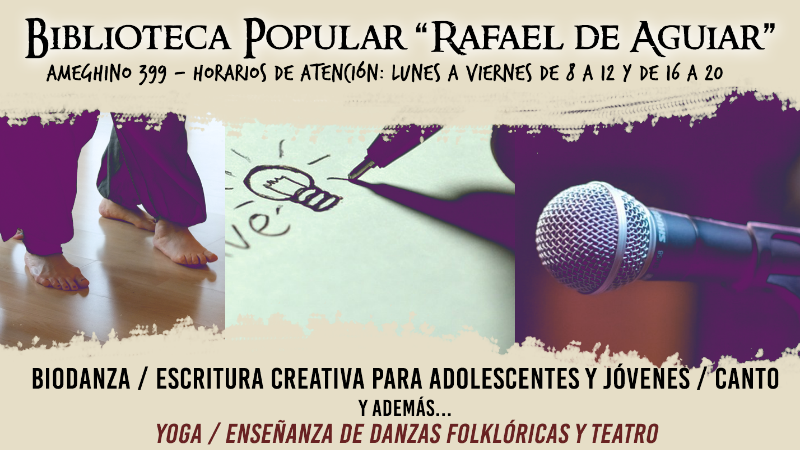 La Biblioteca Popular “Rafael de Aguiar” sumó este año talleres: canto, biodanza y escritura creativa para adolescentes y jóvenes. Además, continuarán con los que ya vienen desarrollando desde hace algunos años, es decir teatro, yoga y enseñanza de danzas folklóricas.
