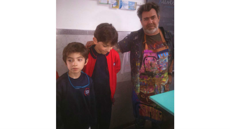 Se acerca la Semana de las Artes y en este marco el artista plástico Milo Lockett visitó el Instituto San Juan Bautista. Compartió la tarde con alumnos de 3° año A, la docente del curso, Virna, y directivos, Claudia Principiano y Patricia Polverigiani.