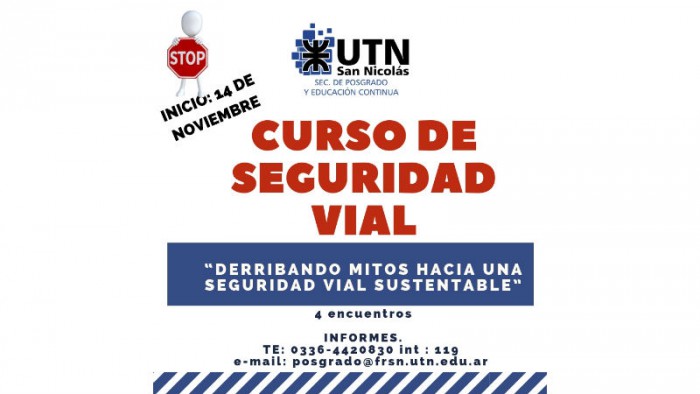 El miércoles 14 de noviembre 2018 comienza el Curso de Seguridad Vial, “Derribando mitos hacia una seguridad vial sustentable” dictado por el Téc. Sup. en Seguridad Vial UTN - FRSN Héctor Escalera. Serán 4 encuentros, los días miércoles de 18:00 hs a 21:30 hs.
