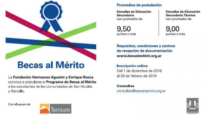 Recordamos que está abierta la inscripción para participar de las Becas al Mérito que otorga la Fundación Hermanos Agustín y Enrique Rocca para alumnos de escuelas secundarias de San Nicolás y Ramallo que posean promedios de excelencia, compromiso con el estudio y buen comportamiento.