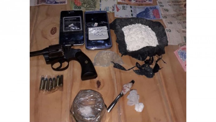 Al ingresar a la vivienda lograron secuestrar un revolver, 100 gr de cocaína compactada, dinero en efectivo, más elementos de estiramiento y fraccionamiento de la droga.