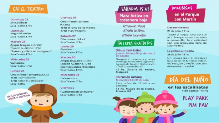 Organizado por la Municipalidad de San Nicolás, desde el 20 de julio al 4 de agosto, lugares como el Teatro y Auditorio Municipal, junto a espacios públicos de la ciudad como el Paseo Costanero y el Parque San Martin, serán los puntos y referencias centrales de numerosos y atractivos espectáculos infantiles.
