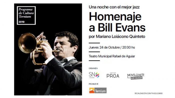 El 24 de octubre a las 20.30 hs en el Teatro Municipal Rafael de Aguiar tendrá lugar un nuevo espectáculo del ciclo Cultura Ternium 2019, recreando una noche de jazz en reconocimiento a Bill Evans y su paso por San Nicolás. El evento es promovido por Ternium Argentina, con la organización de la Fundación PROA y la Subsecretaría de Cultura de la Municipal de San Nicolás.