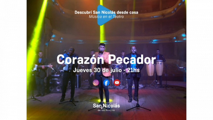 El jueves 30 de julio a las 21 hs. en el ciclo “Música en el Teatro” que organiza la Municipalidad de San Nicolás se presentará el grupo de cumbia “Corazón pecador”, para que todos los nicoleños disfruten de este recital desde sus casas.