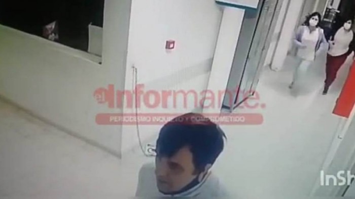Diario El informante accedió en exclusiva a un video donde se lo ve al hombre sospechado de ser responsable de la muerte de tres de sus familiares, en los pasillos del Hospital San Felipe, mientras sacan del box a su madre tras un llamado de el avisando que se descompensó de repente.