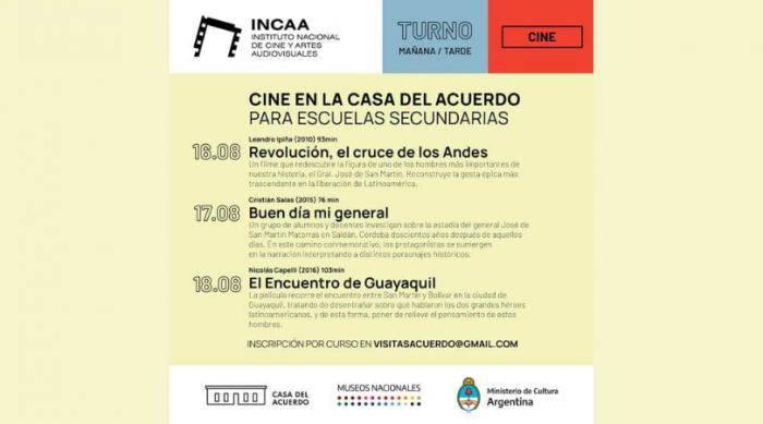 Desde el Museo Nacional Casa del Acuerdo, invitan a docentes y alumnos de las Escuelas Secundarias de San Nicolás y la región, a una jornada de cine argentino.