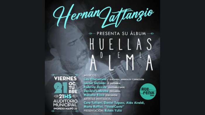 El músico, cantante, guitarrista y compositor Hernán Lattanzio y “Ave Fénix Música”, presentan este nuevo álbum discográfico el 21 de octubre, a las 21.00 hs. en el Auditorio Municipal de nuestra ciudad. Este evento contará con la presencia en vivo de una selección de importantes músicos provenientes de las ciudades de La Rioja, San Nicolás y la región. El material discográfico “Huellas del alma” fue grabado en La Rioja, bajo la dirección musical del maestro Luis Chazarreta.
