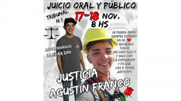 Los días 17 y 18 de noviembre en el Palacio de Tribunales de San Nicolás se llevará a cabo el juicio oral y público por el homicidio del joven Agustín Franco.