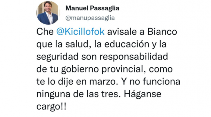 En tanto, Manuel Passaglia respondió en su cuenta de Twitter: "Che @Kicillofok avisale a Bianco que la salud, la educación y la seguridad son responsabilidad de tu gobierno provincial, como te lo dije en marzo. Y no funciona ninguna de las tres. Háganse cargo!!".