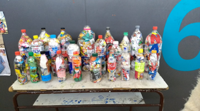 Para llenar las “botella de amor” se puede incluir: envoltorios plásticos de todo tipo, bolsa de super, envoltorio de fiambres, film, potes, palitos de chupetín, pomo de dentífrico, cepillo de dientes, maquinitas de afeitar (retirar el filo de metal) fiselina, etc.