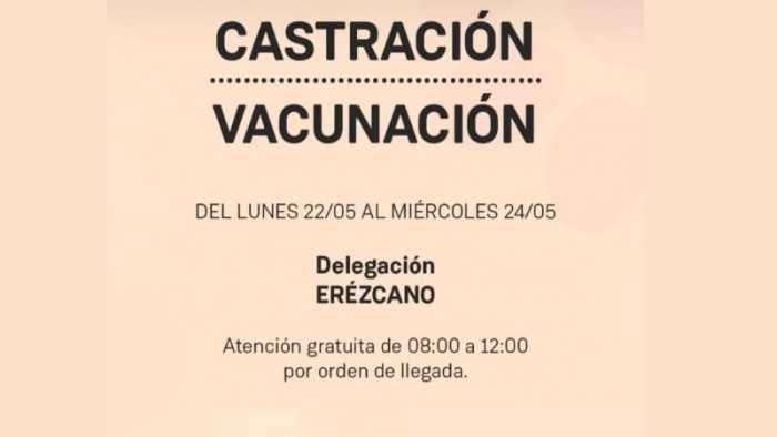 Desde este lunes 22 y hasta el miércoles 24 de mayo de 8:00 a 12:00, el trailer de castración y vacunación de la Municipalidad de San Nicolás estará ubicado en la delegación de Erézcano.