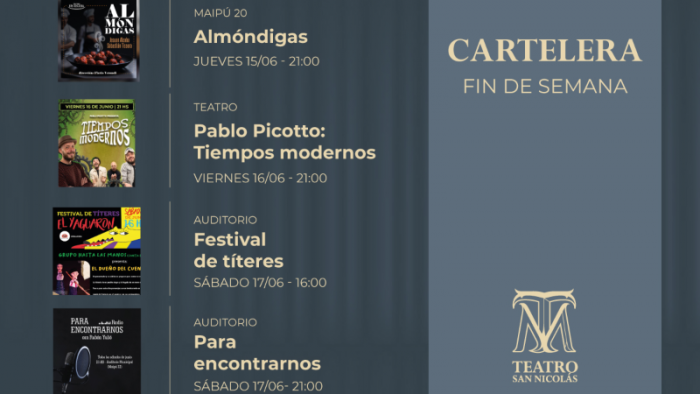En primer lugar llega la producción teatral nicoleña “Almóndigas”, protagonizada por Jesuán Alcoba y Sebastián Tissera y con la dirección de Flavio Verandi. La obra se presentará el jueves 15 a las 21:00 con ingreso del público por calle Maipú 20.