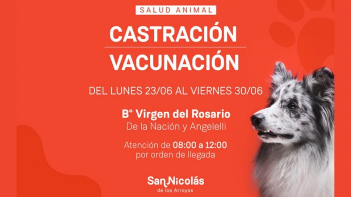 El tráiler de castración y vacunación de la Municipalidad de San Nicolás estará desde el lunes 26 al viernes 30 de junio en el salón comunitario de barrio Virgen del Rosario (De la Nación y Angelelli). La atención será gratuita y por orden de llegada en el horario de 8:00 a 12:00.