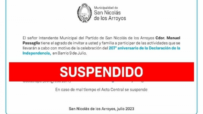 La Municipalidad de San Nicolás informó que por razones organizativas se suspendieron las actividades protocolares programadas para el domingo 9 de julio con motivo de celebrarse el Día de la Independencia.